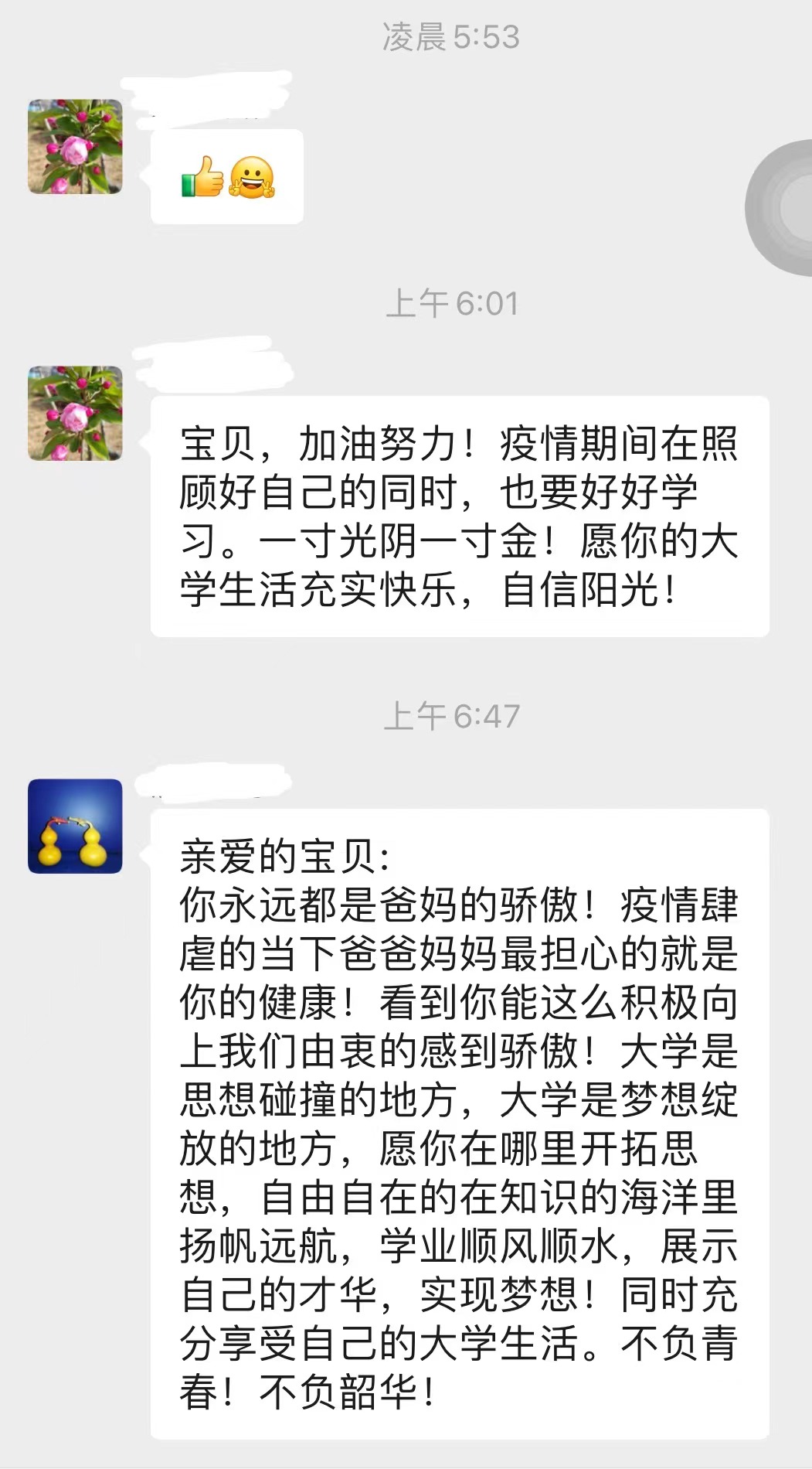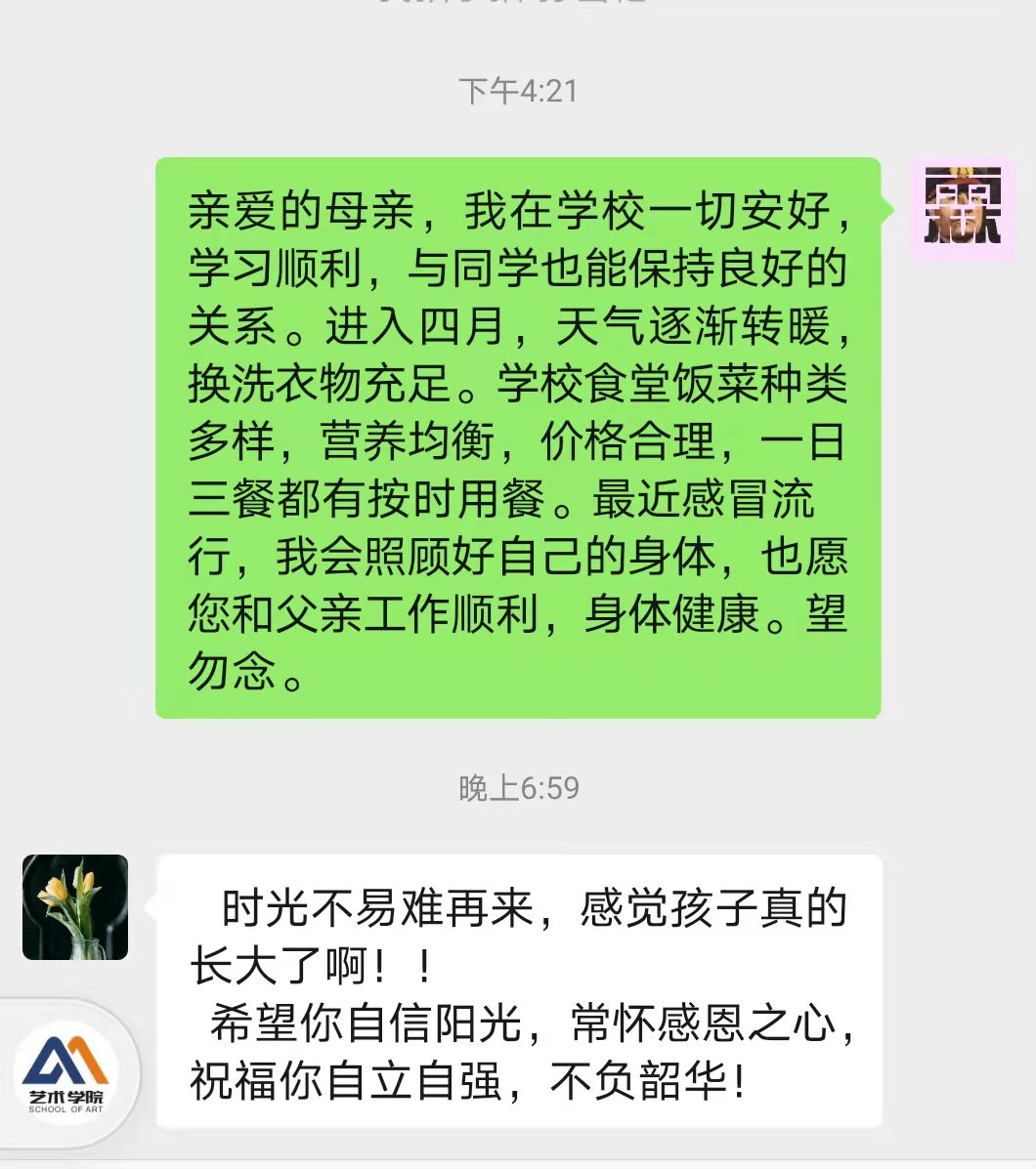 以微信家书的形式向家长汇报在校日常宿舍生活、学习状况、饮食起居及文娱活动等: